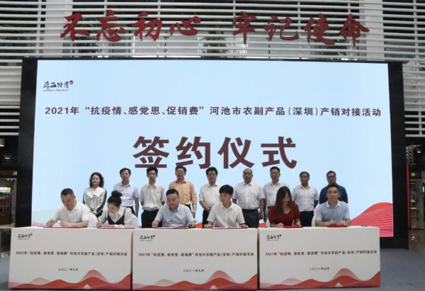 9 月 25 日,深圳市海吉星消费帮扶中心举办 "2021 年‘抗疫情、感党恩、促消费’河池市农副产品(深圳)产销对接 " 活动,现场签约金额达 1.66 亿元。