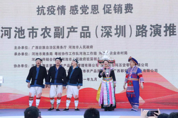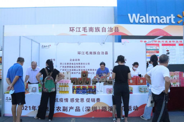 当天下午,2021年河池市农副产品(深圳)路演推介活动在深圳市沃尔玛(香蜜湖店)举行,路演推介活动专门设置了农产品特装展位,展期持续两天,用以展销野生山茶油、桑蚕丝制品、旱藕粉丝、大米、茶叶、山泉水等300多种优质农产品。此外,展销期间还开设直播带货专题活动,市民无需亲自到场,即可在线上畅购河池好物。